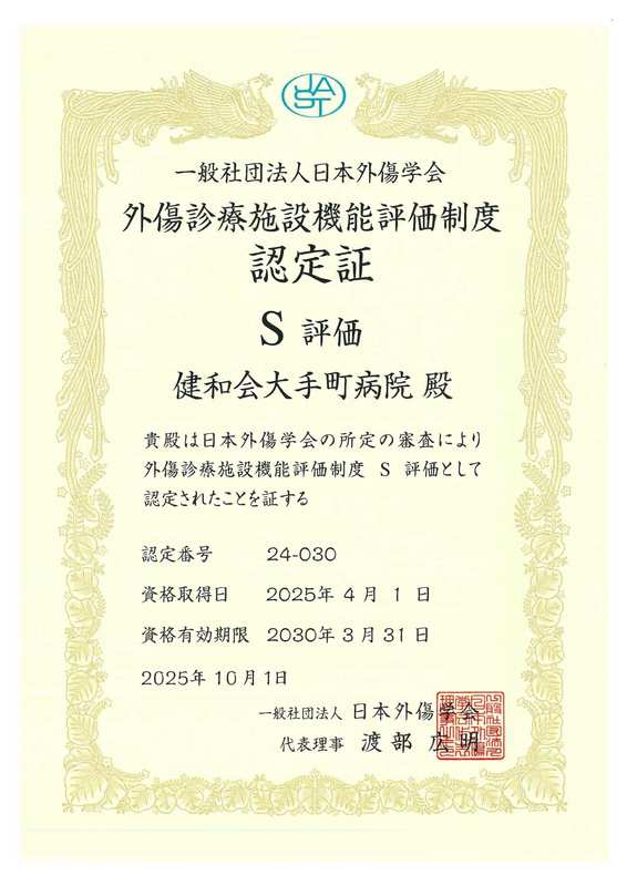 健和会大手町病院は、2025年10月1日付で日本外傷学会が実施する外傷診療施設機能評価において、「S」評価の認定を受けました。