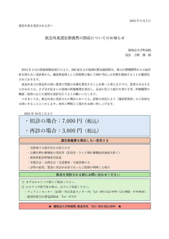 救急外来選定療養費の徴収についてのお知らせ 2025年09月19日 お知らせ 救急外来選定療養費の徴収についてのお知らせ ■開始日 2025 年10月1日 8:40〜 ■時間:診療日8:40〜16:30 選定療養費についてはコチラを参照されてください。 一覧を見る