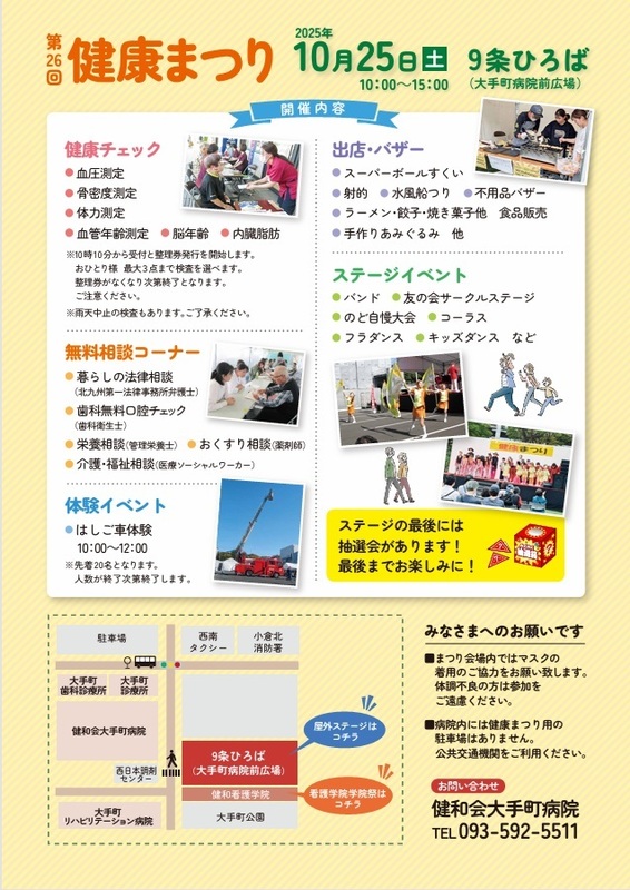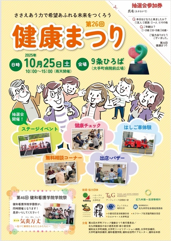 小倉北区大手町にある大手町病院や大手町リハビリテーション病院などの当会が運営する医療、介護、福祉の事業所と北九州健康友の会の各支部が主催で「安心して住み続けられるまちづくりと健康増進を地域のみなさんと協同してすすめる場」として、健康まつりを開催しており、今年で26回目を迎えました。